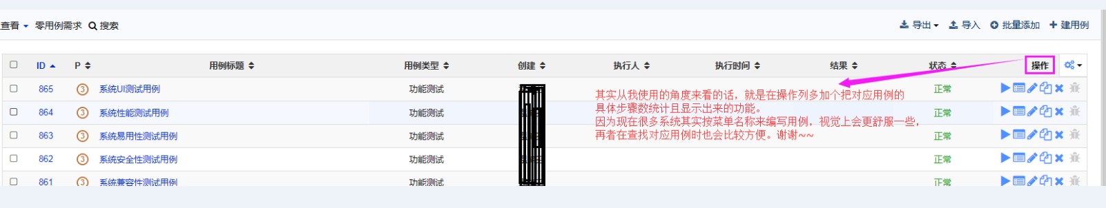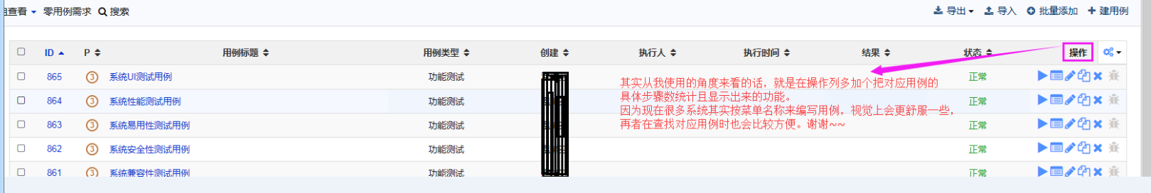 批量创建的测试用例(未写步骤和预期)执行时无法填写“实际测试结果”,和单独创建的测试用例执行界面不一样,这里可以不做区分,都调出同样的窗口;或者批量创建用例的时候测试步骤和用例标题默认一致(有的测试场景比较简单,看标题就足够了)