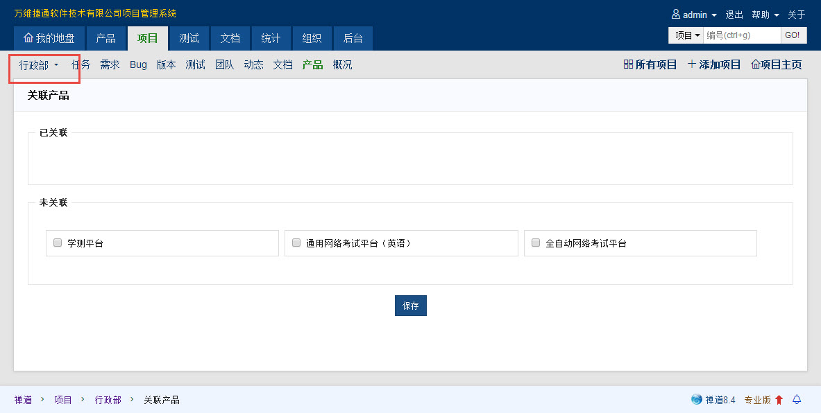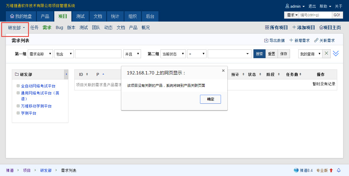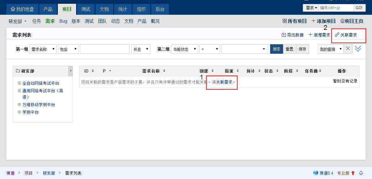 项目中未关联任何需求,当通过需求列表中关联需求,无法正常操作