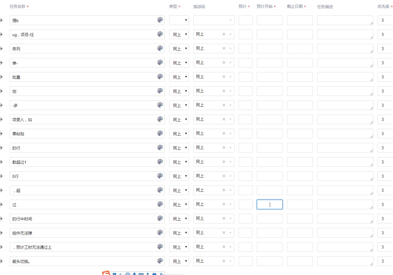 提bug,项目-任务列表-批量创建-多项录入,如果粘贴的行数超过10行,超过的行中时间控件无法弹出,预计工时无法通过上下箭头切换。