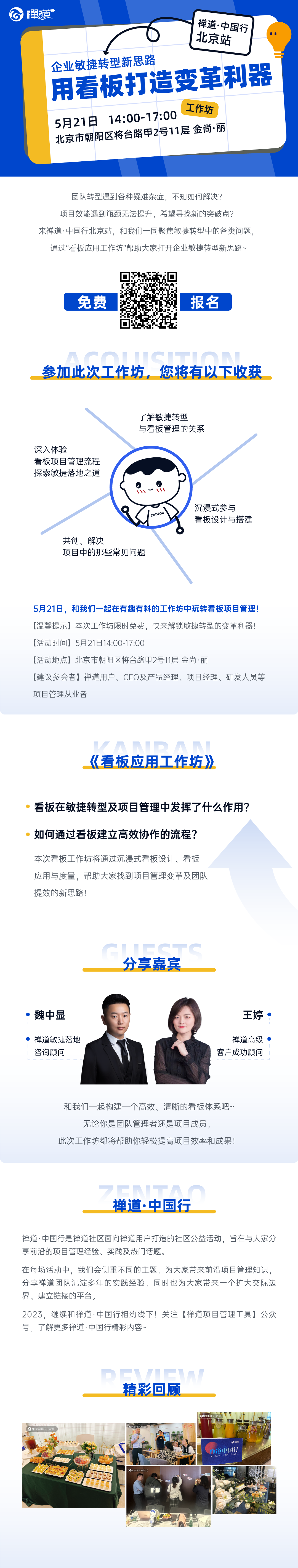 团队转型遇到各种疑难杂症,不知如何解决?项目效能遇到瓶颈无法提升,希望寻找新的突破点?来禅道·中国行北京站,和我们一同聚焦敏捷转型中的各类问题,通过“看板应用工作坊”帮助大家打开企业敏捷转型新思路~ 参加此次工作坊,您将有以下收获: 5月21日,和我们一起在有趣有料的工作坊中玩转看板项目管理! 【温馨提示】本次工作坊限时免费,快来解锁敏捷转型的变革利器! 【活动时间】5月21日14:00-17:00 【活动地点】 北京市朝阳区将台路甲2号11层 金尚·丽 【建议参会者】 禅道用户、CEO及产品经理、项目经理、研发人员等项目管理从业者 【惊喜环节】现场抽取一位幸运观众获赠一份价值6500元的IDCF 研发效能(DevOps)黑客马拉松挑战赛课程名额 ▶ 看板应用工作坊 ◀ 【分享嘉宾】 魏中显:禅道敏捷落地咨询顾问 王婷:禅道高级客户成功顾问 【话题介绍】 和我们一起构建一个高效、清晰的看板体系吧~无论你是团队管理者还是项目成员,此次工作坊都将帮助你轻松提高项目效率和成果! 扫描下方二维码,免费报名! 禅道·中国行是禅道社区面向禅道用户打造的社区公益活动,旨在与大家分享前沿的项目管理经验、实践及热门话题。在每场活动中,我们会侧重不同的主题,为大家带来前沿项目管理知识,分享禅道团队沉淀多年的实践经验,同时也为大家带来一个扩大交际边界、建立链接的平台。 2023,继续和禅道·中国行相约线下!关注【禅道项目管理工具】公众号,了解更多禅道·中国行精彩内容~
