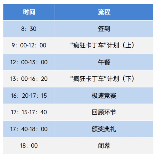 拒绝材料包拼装!本次“疯狂卡丁车”计划,从设计研讨、结构连接到动手制作、测试改进,大家需要通过彼此协作实现汽车从0到1的设计与组装。在极速竞赛环节,大家更要凭借自己超凡的驾驶技术,灵活穿越各种障碍,随时掌控 方向和速度,在最短时间内到达终点,赢得比赛。