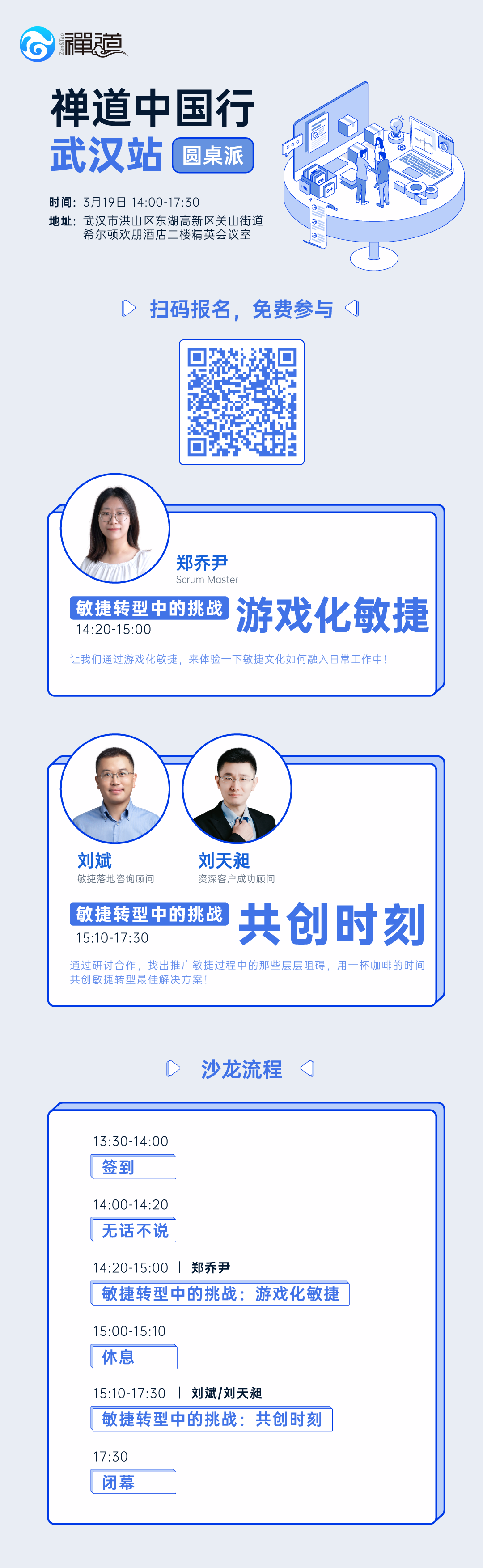 此次禅道·中国行【武汉站】,我们将开启【敏捷转型圆桌派】,一同聊聊那些困扰我们的敏捷落地问题!好想法就是在讨论中碰撞出来的!