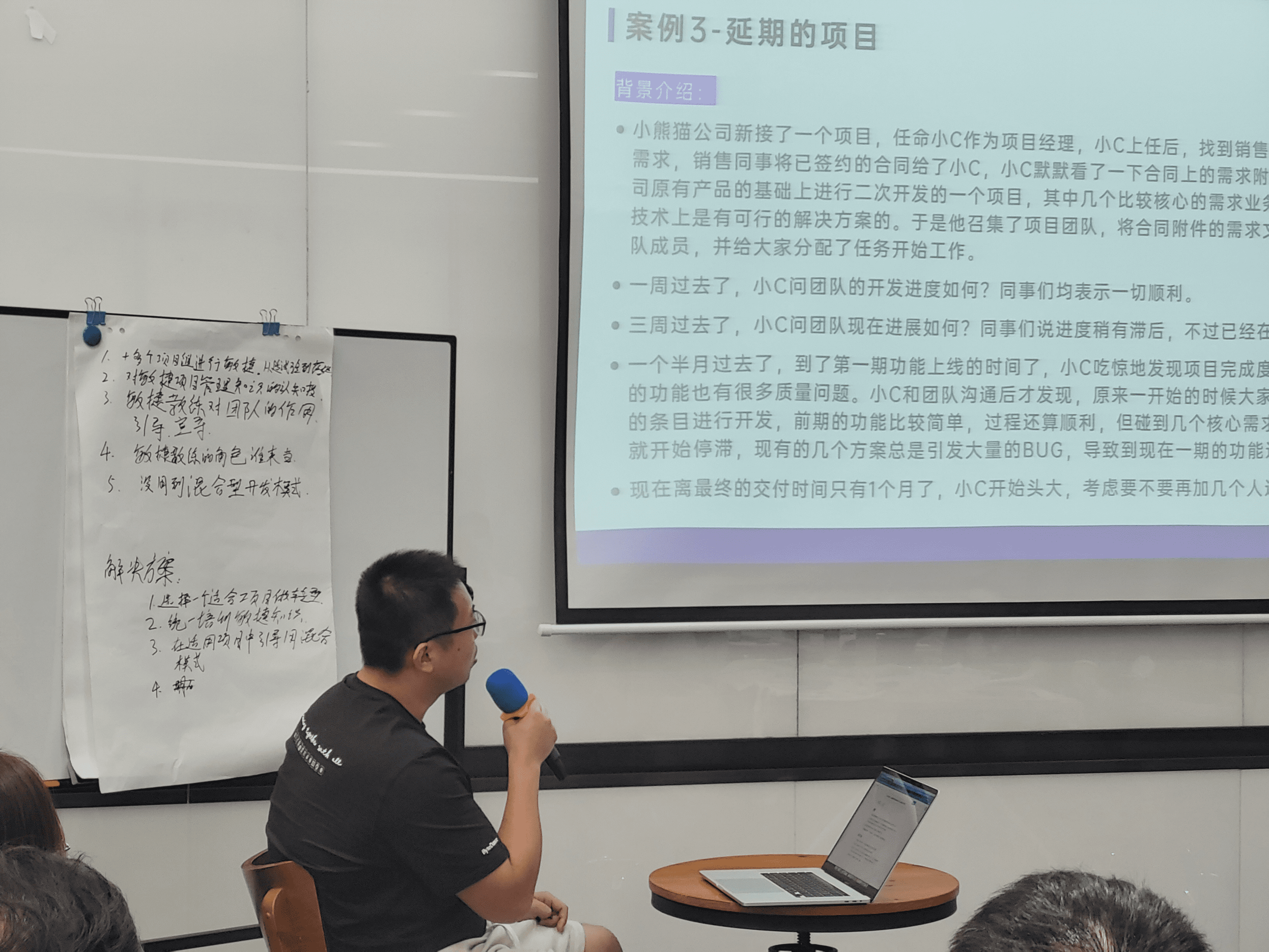 上半场《敏捷实践-问剑项目经理》,以“项目管理”为切入点,将大多数项目团队都会面临的项目管理难题,浓缩至4个不同的虚拟案例中,参会者通过小组探讨、共创,得出解决方案。