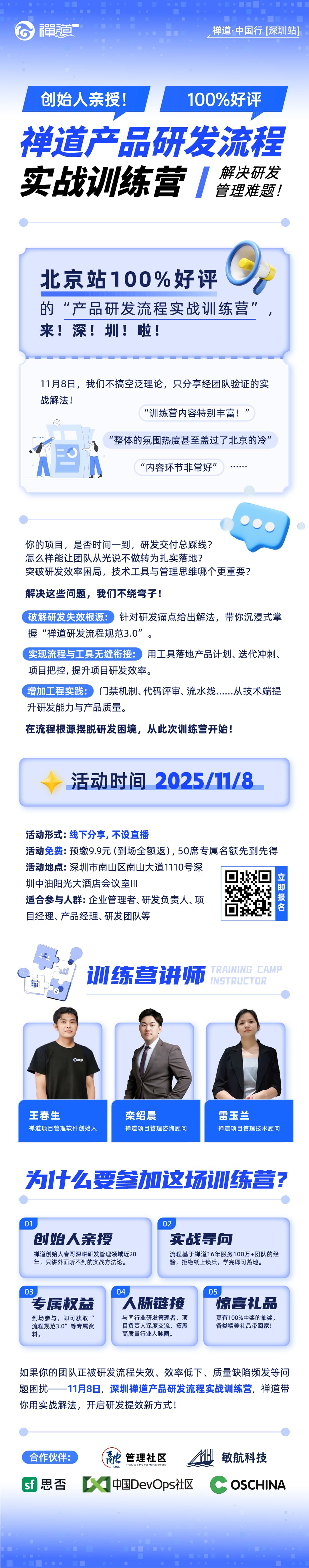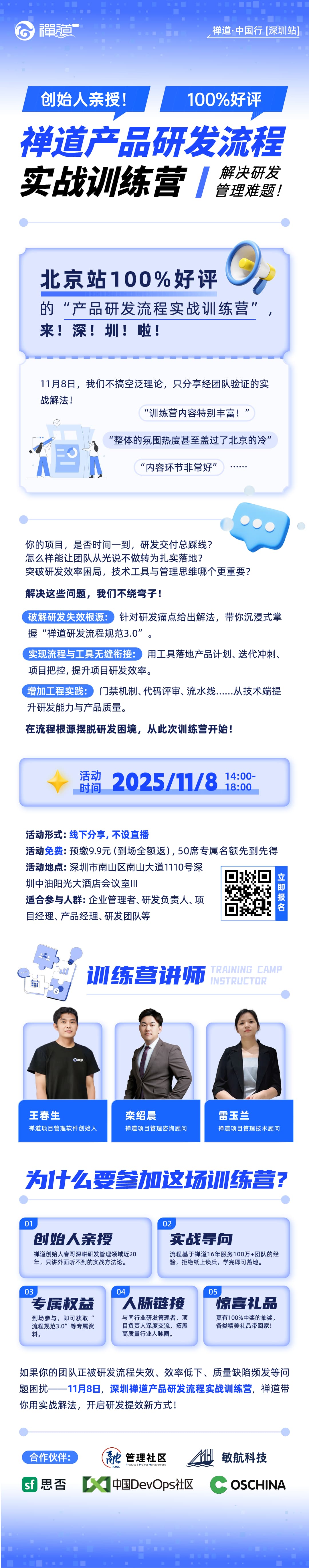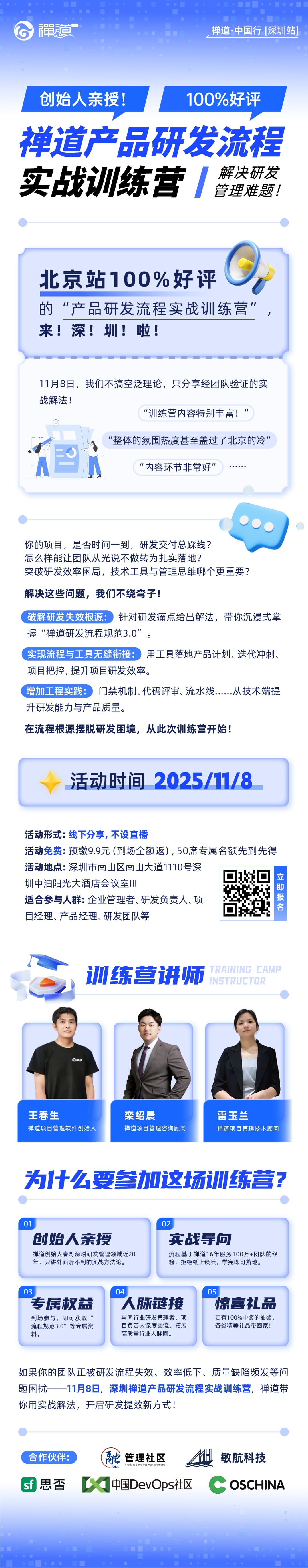 如果你的团队正被研发流程失效、效率低下、质量缺陷频发等问题困扰——11月8日,深圳禅道产品研发流程实战训练营,禅道带你用实战解法,开启研发提效新方式!