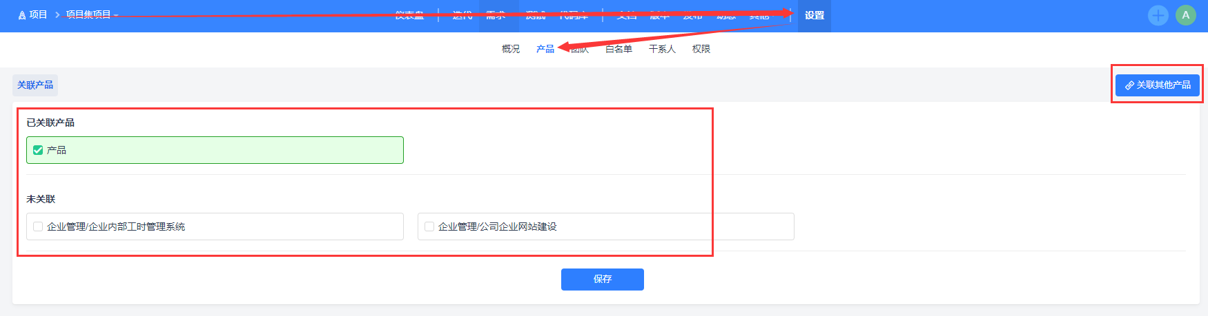 🚢 你好 在产品-项目下关联项目的下拉列表中,只显示和产品在同一项目集下的项目 咱们可以确认下需要关联的B、C两个项目的所属顶层项目集和产品是同一个项目集吗? 或者可以看下点击项目,进入项目后,设置-产品,看下是否有需要关联的产品,如果没有的话,点下右上角关联其他产品找一下呢