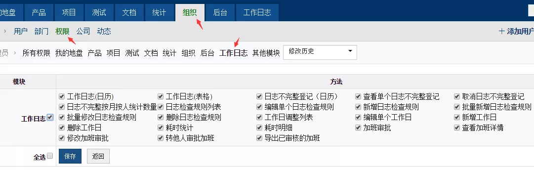2.安装好后,需要授权才能看到菜单入口。 2.1 以管理员身份登录禅道,导航至:组织-权限,点击分组右侧的“权限维护"按钮 2.2 弹开的页面中,点击“工作日志”,勾选要给此分组来分配权限,保存后,使用此分组下的用户重新登录,即可看到“工作日志”菜单