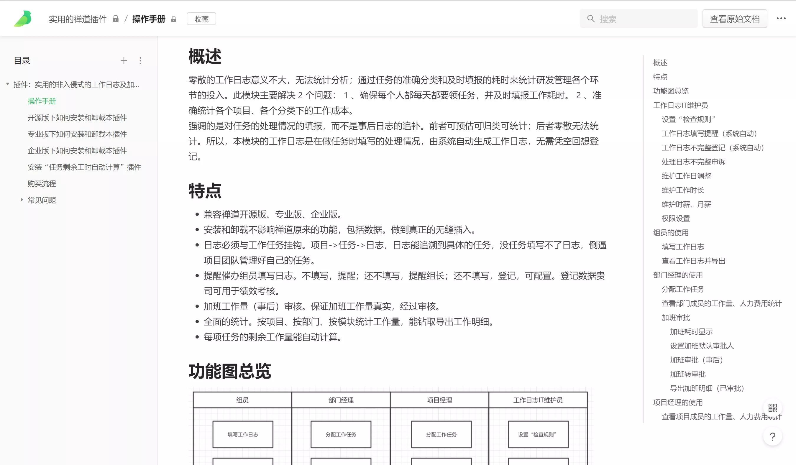 · 兼容禅道开源版、专业版、企业版。· 安装和卸载不影响禅道原来的功能,包括数据。做到真正的无缝插入。· 日志必须与工作任务挂钩。项目->任务->日志,日志能追溯到具体的任务,没任务填写不了日志,倒逼项目团队管理好自己的任务。· 提醒催办组员填写日志。不填写,提醒;还不填写,提醒组长;还不填写,登记,可配置。登记数据贵司可用于绩效考核。· 加班工作量(事后)审核。保证加班工作量真实,经过审核。· 全面的统计。按项目、按部门、按模块统计工作量,能钻取导出工作明细。· 每项任务的剩余工作量能自动计算。· 支持为缺陷填写开发或测试的工作量和工作内容,自动转为工作日志,并纳入项目工作量统计· 兼容性非常好,能很好兼容禅道最新版本。兼容测试也很及时,从16年开始,总是在第一时间做禅道最新版本的测试。· 支持钉钉/飞书工作消息通知,可以选择邮件/钉钉/飞书选其一或同时同时发送(10.8版本)